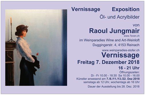 Nach dem Leitspruch „Die Kunst ist zwar nicht das Brot, aber wohl der Wein des Lebens“, möchten wir Sie, Ihre Familie und Freunde herzlich zur Vernissage & Bilderausstellung von Raoul Jungmair am Freitag 7. Dez. 2017 von 16:00 bis 21:00 Uhr im Weinparadies einladen.